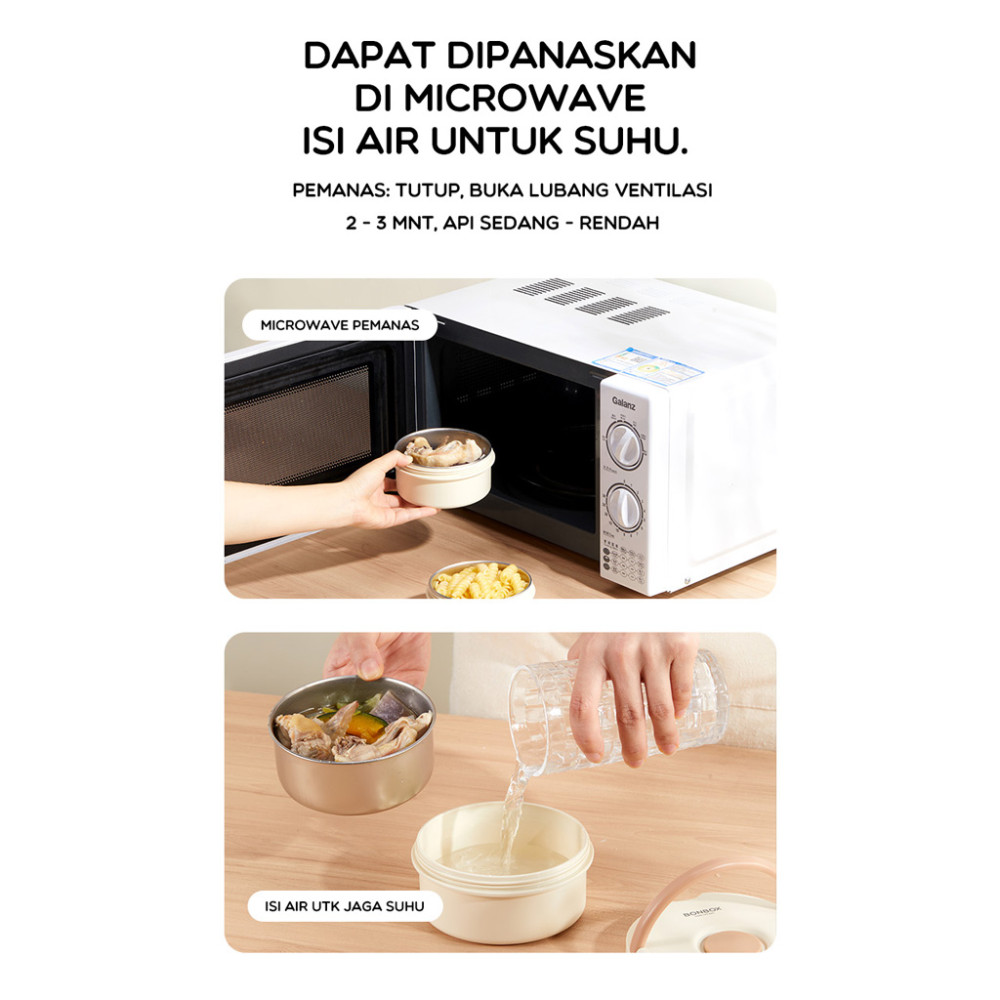 4. Multiguna! Bisa dipanaskan di Microwave (PENTING: buka ventilasi tutup ya!) atau diisi air panas/dingin di dinding luar wadah untuk menjaga suhu makanan lebih lama.