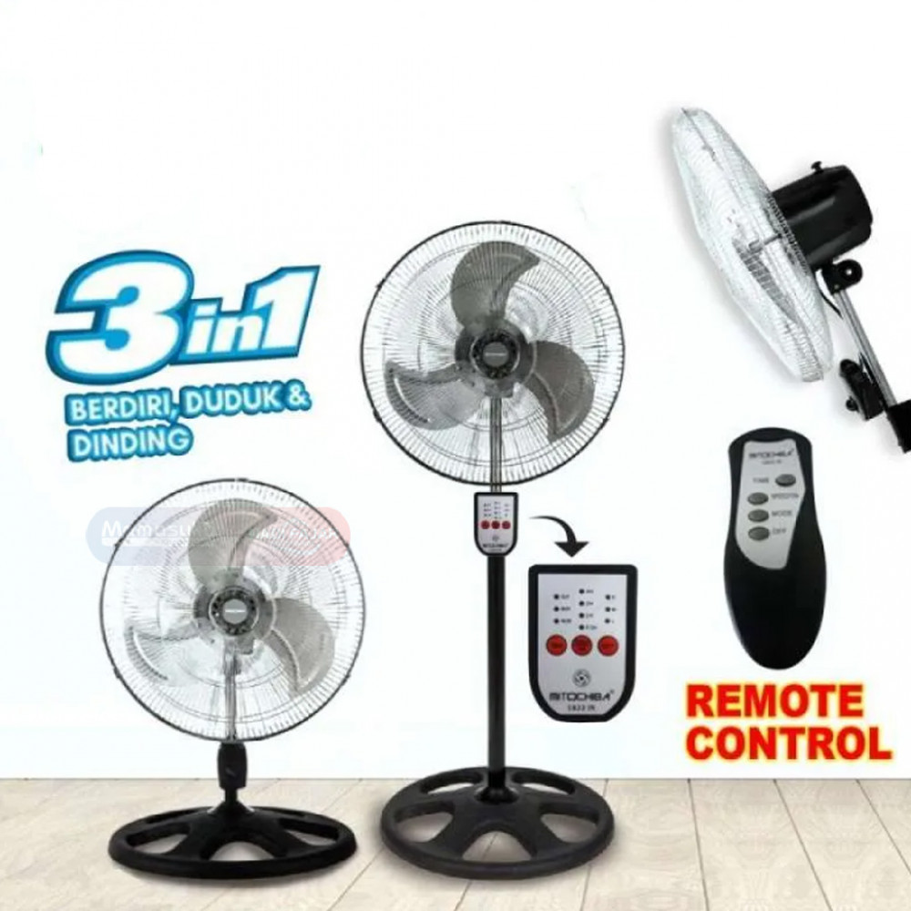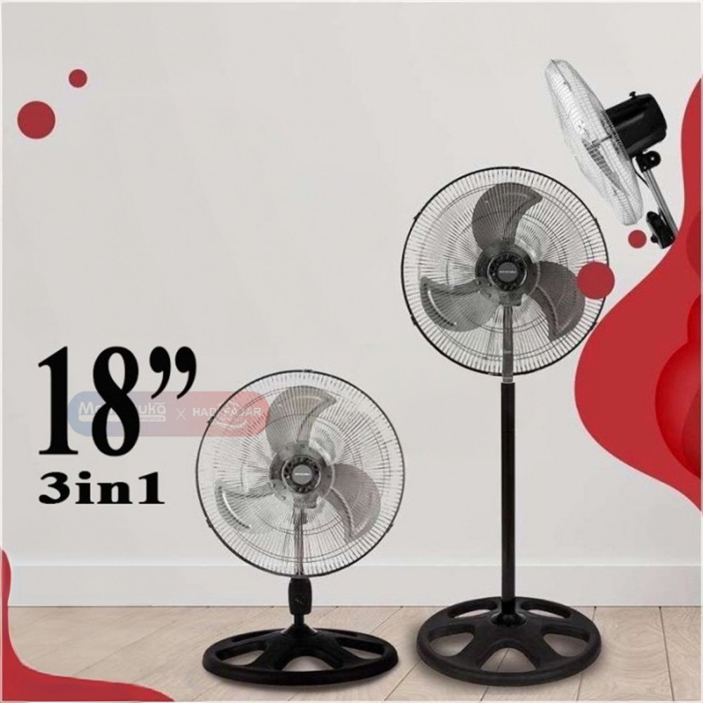 Kipas angin yang multi function yang dapat digunakan berdiri, diletakan di lantai atau meja, dan dapat ditempel ke tembok dengan ukuran 18" menggunakan rangka besi, dan baling menggunakan bahan