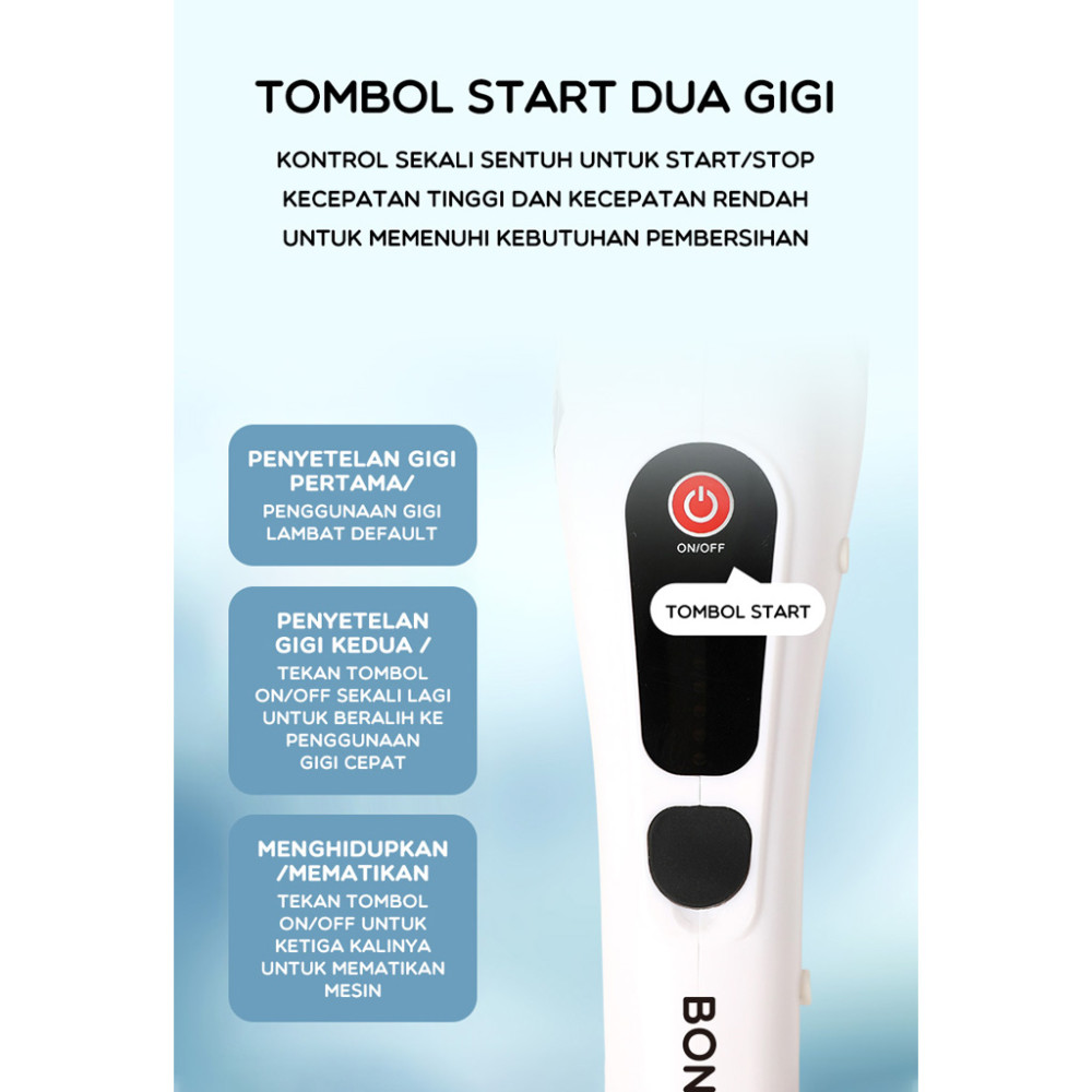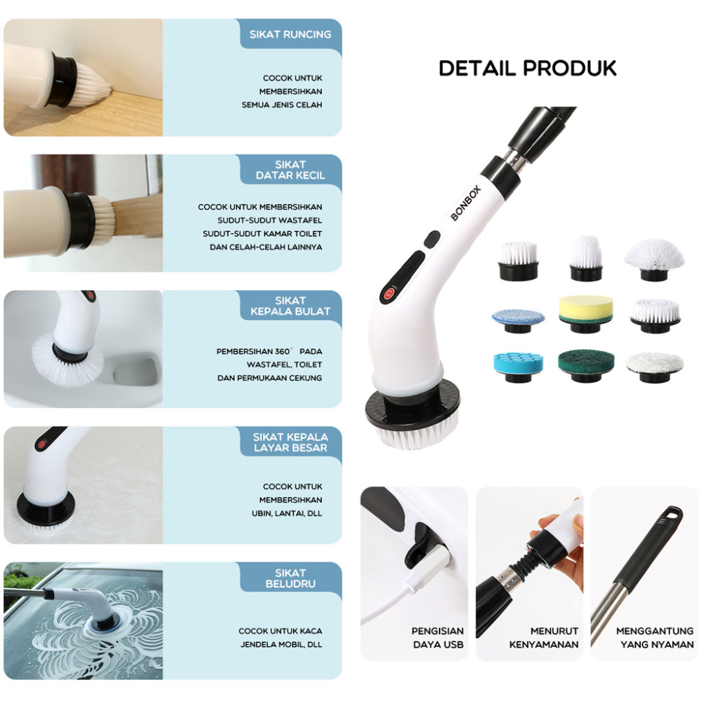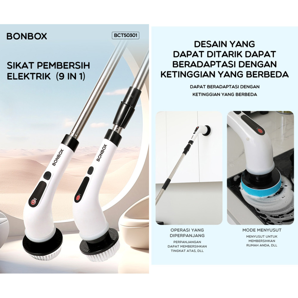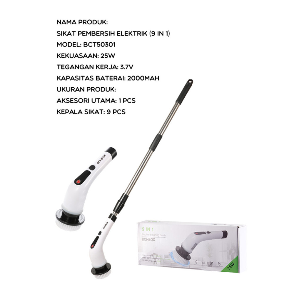 Kakak, BONBOX SIKAT DORONG ELEKTRIK BCT50301 ini solusinya! Capek banget deh kak kalau harus nyikat kamar mandi atau dapur sampai encok? Punggung pegal, tangan lecet? IHH ANNOYING BANGET DEH KAK! Bener kah? Ini sikat ajaib 9-in-1 yang bikin bersih-bersih jadi happy! Sekarang ngepel lantai horeka atau nyikat dapur rumah jadi secepat kilat!