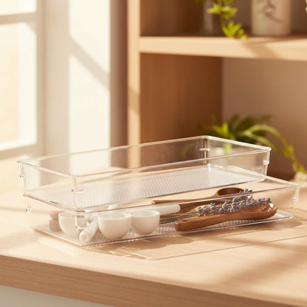 1. Material plastik bening berkualitas, kuat, dan ringan. Gampang dicuci, bikin dapur atau laci tetap higienis. Transparan jadi nggak perlu bongkar-bongkar lagi nyari barang!