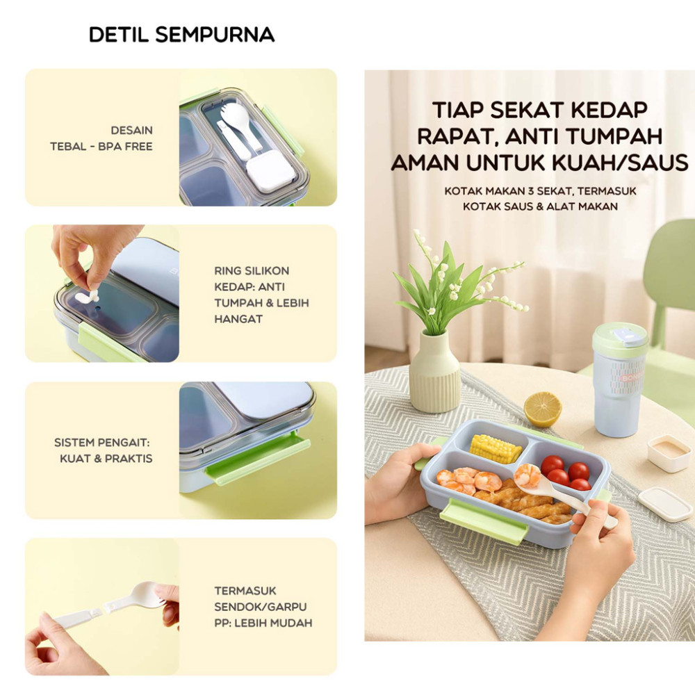 Kotak makan 3 sekat yang anti tumpah total, bikin bawa bekal jadi estetik dan bebas drama kuah bocor. Say goodbye sama tas basah! Ihh anoying banget deh kak kalau kuah tumpah, betul kan kak? 🥲 Sekarang bekal kuah pedas atau salad saus creamy dijamin aman sentosa.