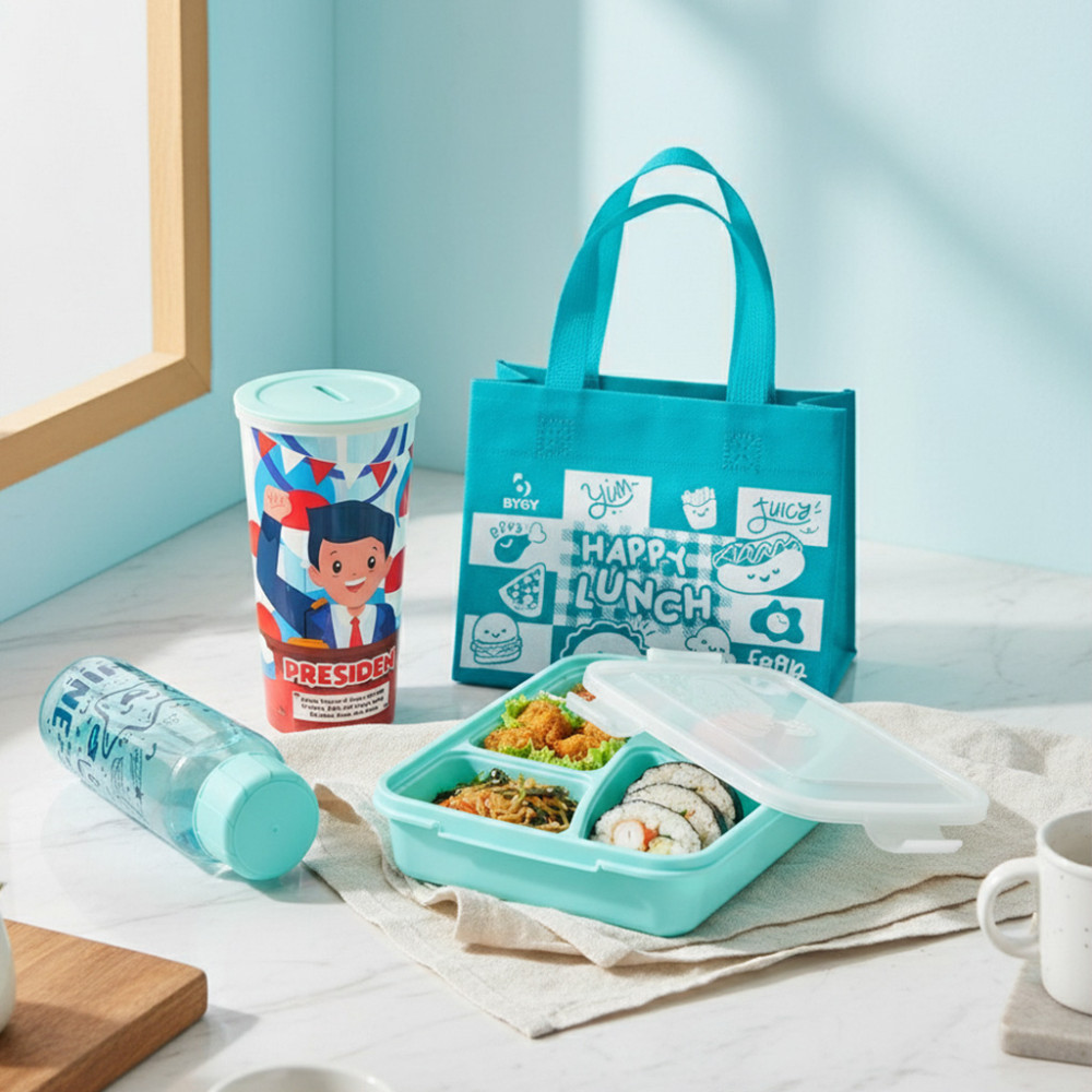 4. Bonus Lunch Bag Gratis: Tas bekal biru "Happy Lunch" yang tahan banting, mudah dicuci, dan siap bawa semua set ini. Nilai jual banget untuk horeka buat bundling produk snack!