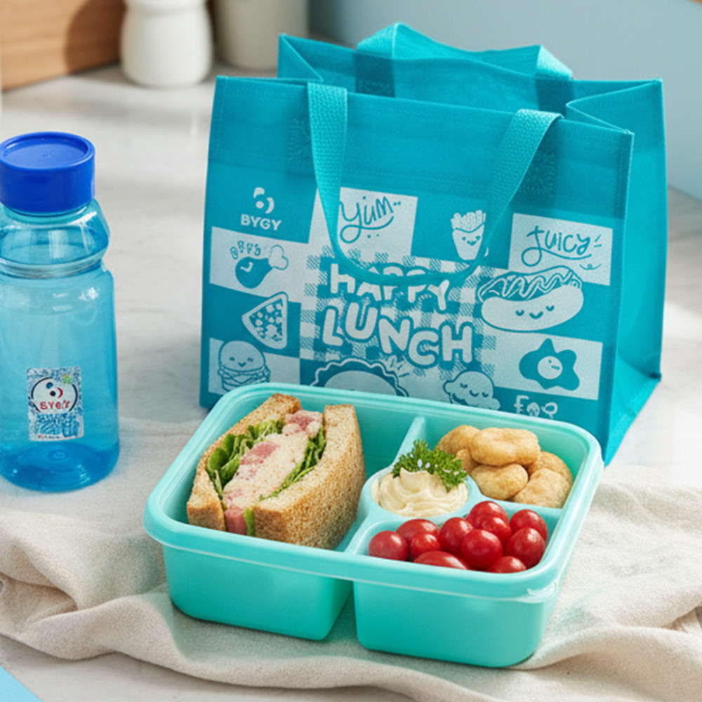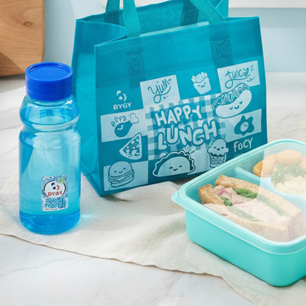 3. Free Lunch Bag fungsional: Tas bekal non-woven warna senada yang gemes abis dengan motif Happy Lunch.