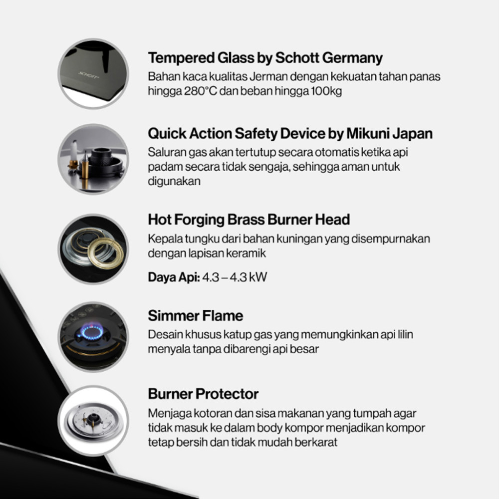 1. Material Tempered Glass SCHOTT, super gampang dibersihkan. Tumpahan kuah? Lap! Beres! Iihh anoying banget deh kalau kompor susah dilap!
