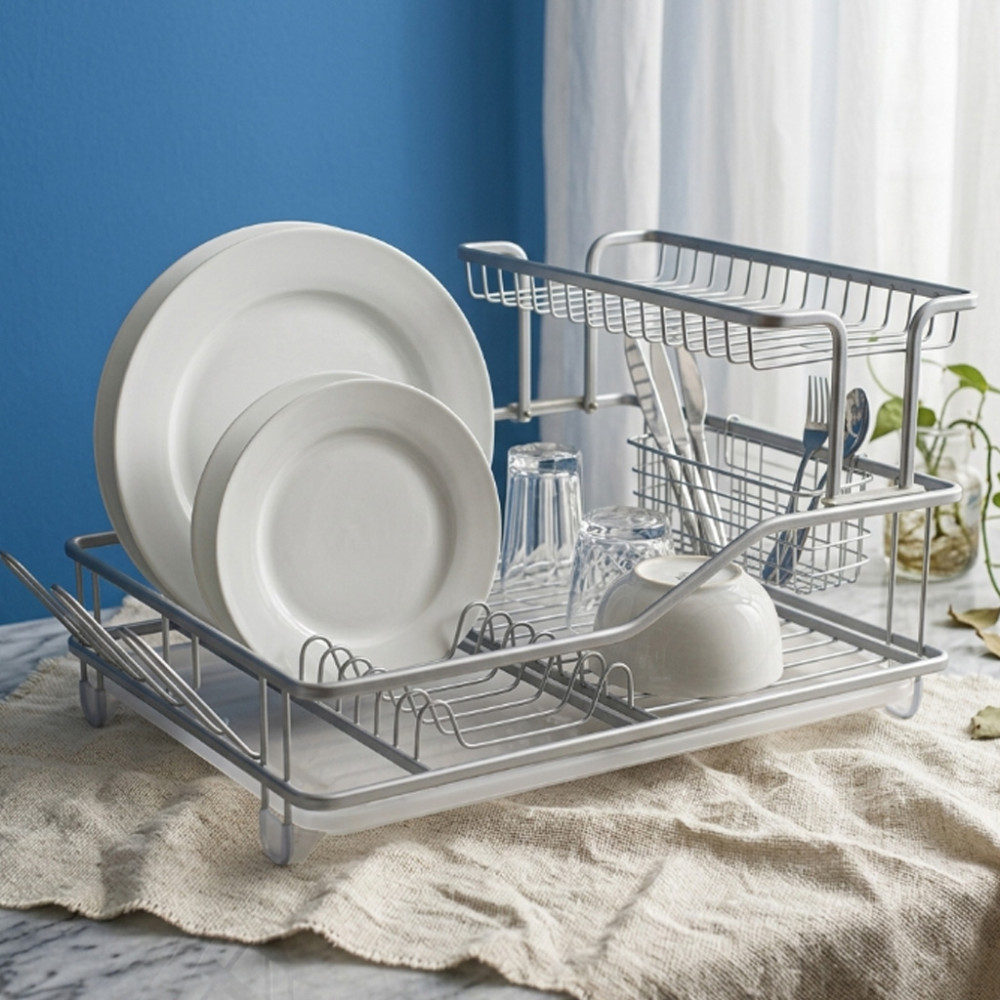 Dilengkapi baki penampung air di bawah — nggak ada lagi cerita meja dapur basah menggenang! Slot piring tegak bikin sirkulasi udara lancar, piring kering merata tanpa perlu dilap satu-satu 🙌