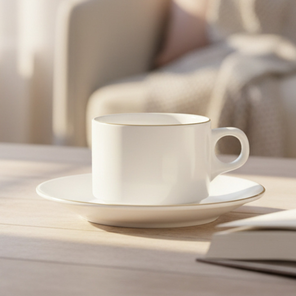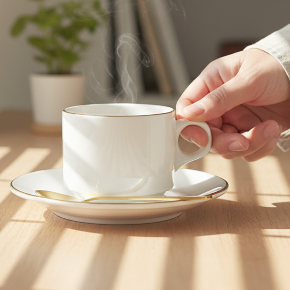 3. Desain Minimalis & Kokoh: Terbuat dari porselen/keramik tebal warna putih, tahan panas, dan minim risiko gompal.