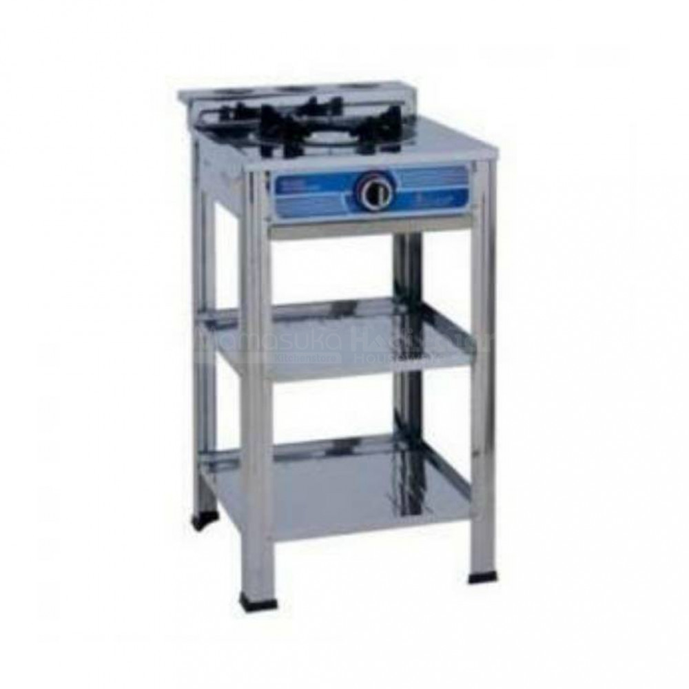 Kompor Winn Gas bertekanan rendah untuk keperluan komersil, dilengkapi dengan rak / meja tinggi berbahan stainless steel. Cocok digunakan untuk berjualan kebab, sosis, dan lain-lain.